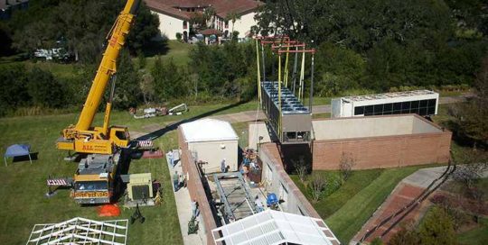 One Tampa City Center: Bentzel Mechanical removed (4) wooden cooling towers with 3000 tons of capacity and replaced with (4) new steel cooling towers with 3600 tons of capacity all while still maintaining building air conditioning. This was done using a Sikorsky S61 Helicopter.